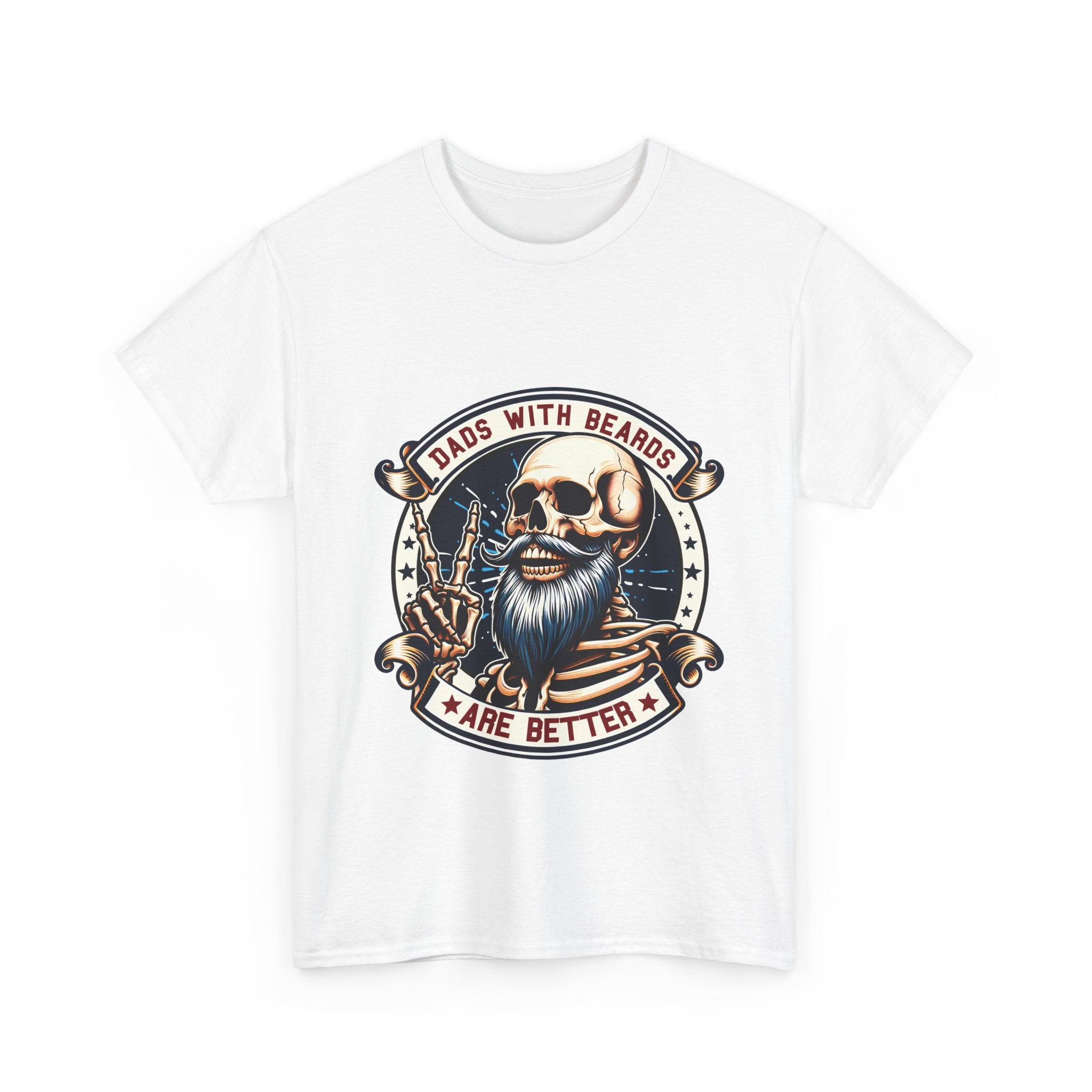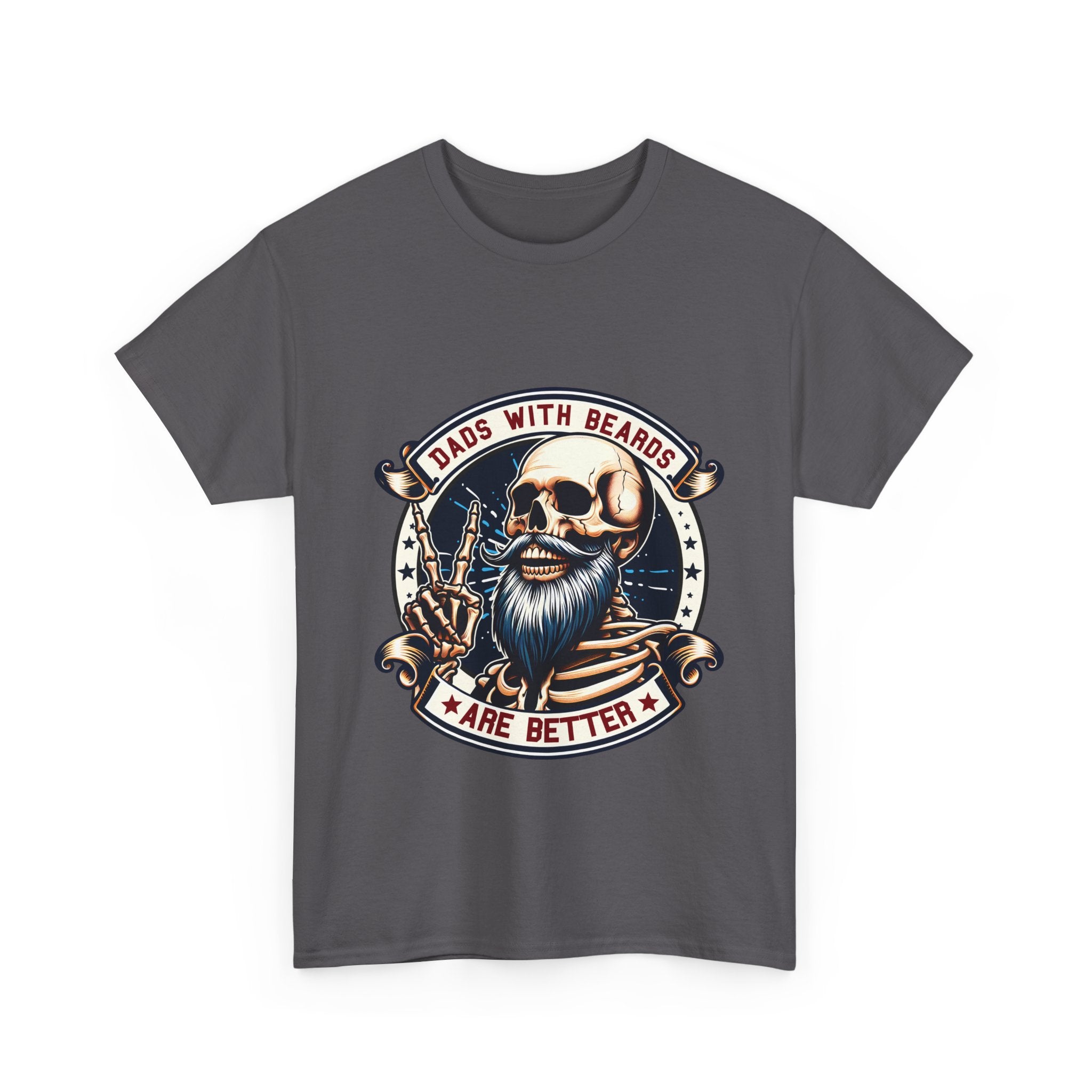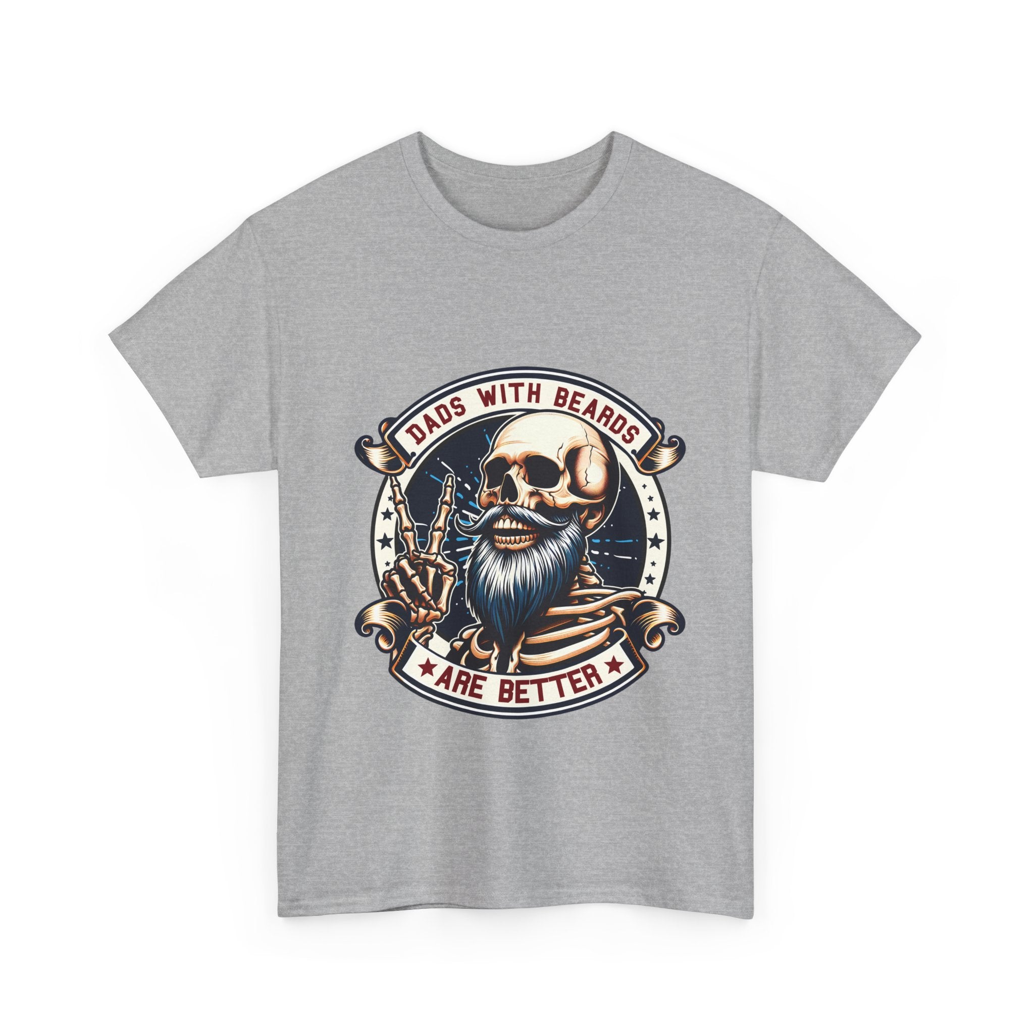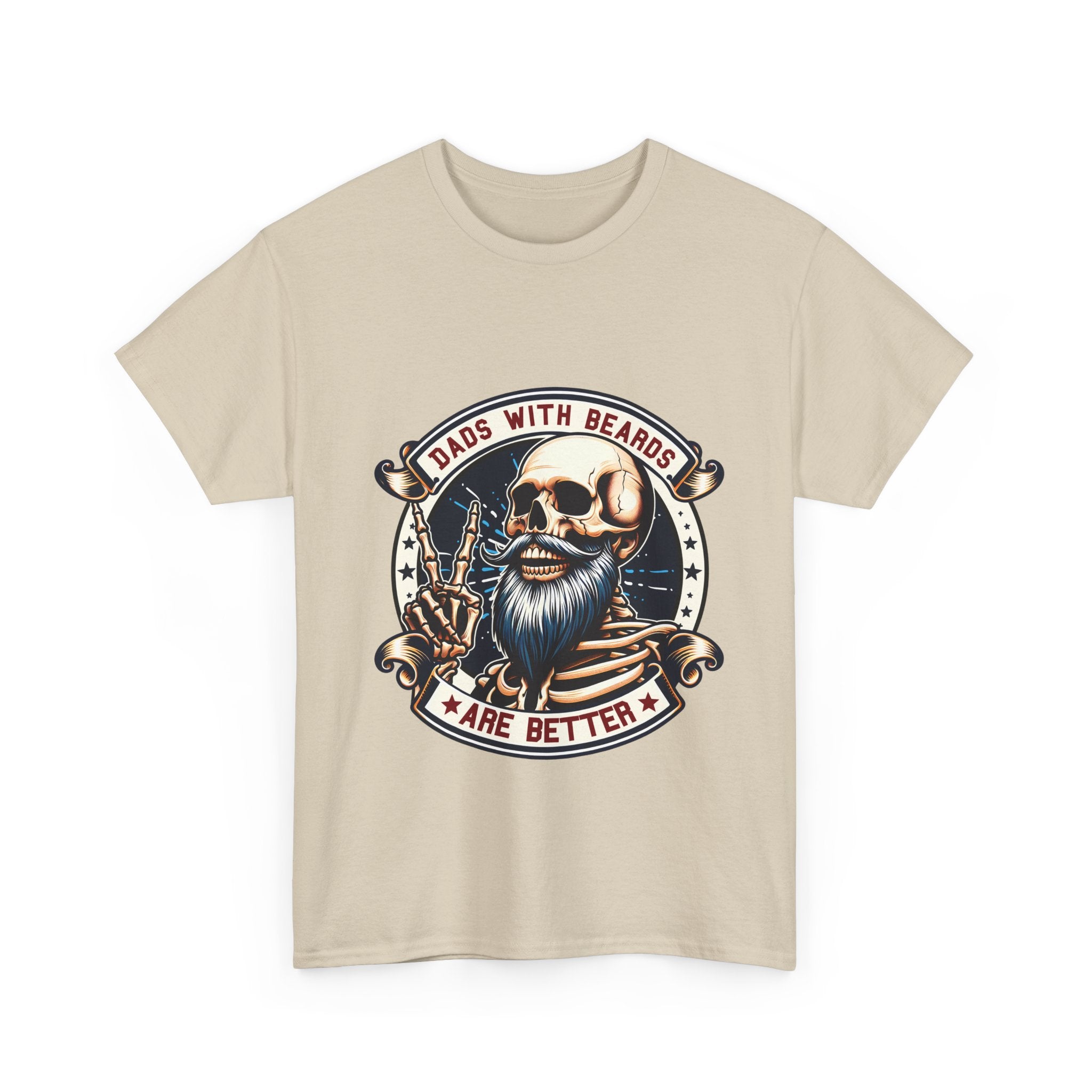 This crew neck tee brings a rugged, funny attitude to everyday wear. The front features a bold, vintage-style skull with a full beard and aviator shades, framed by a ribbon that reads “Dads With Beards Are Better.” The design uses warm, muted tones and finely detailed linework for a worn-in, retro look. Made on a midweight cotton tee with a classic relaxed cut, it sits comfortably for yard work, backyard barbecues, or lazy weekend errands. It’s the kind of shirt a bearded dad would reach for when he wants to feel playful, a little rebellious, and totally himself.