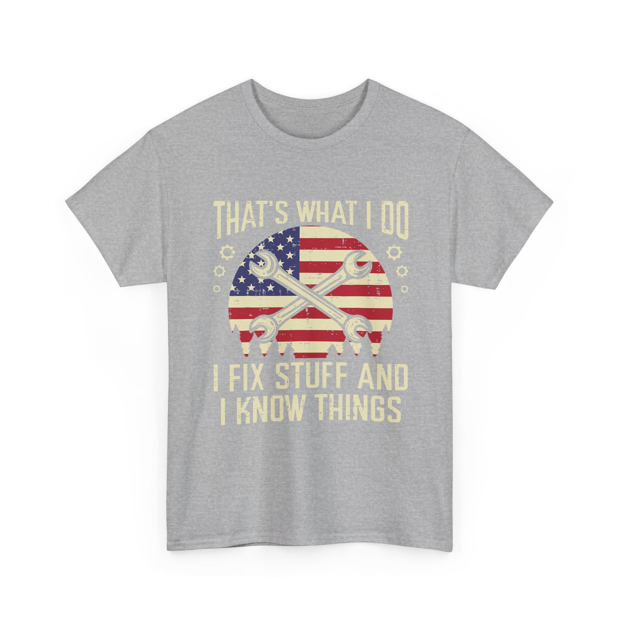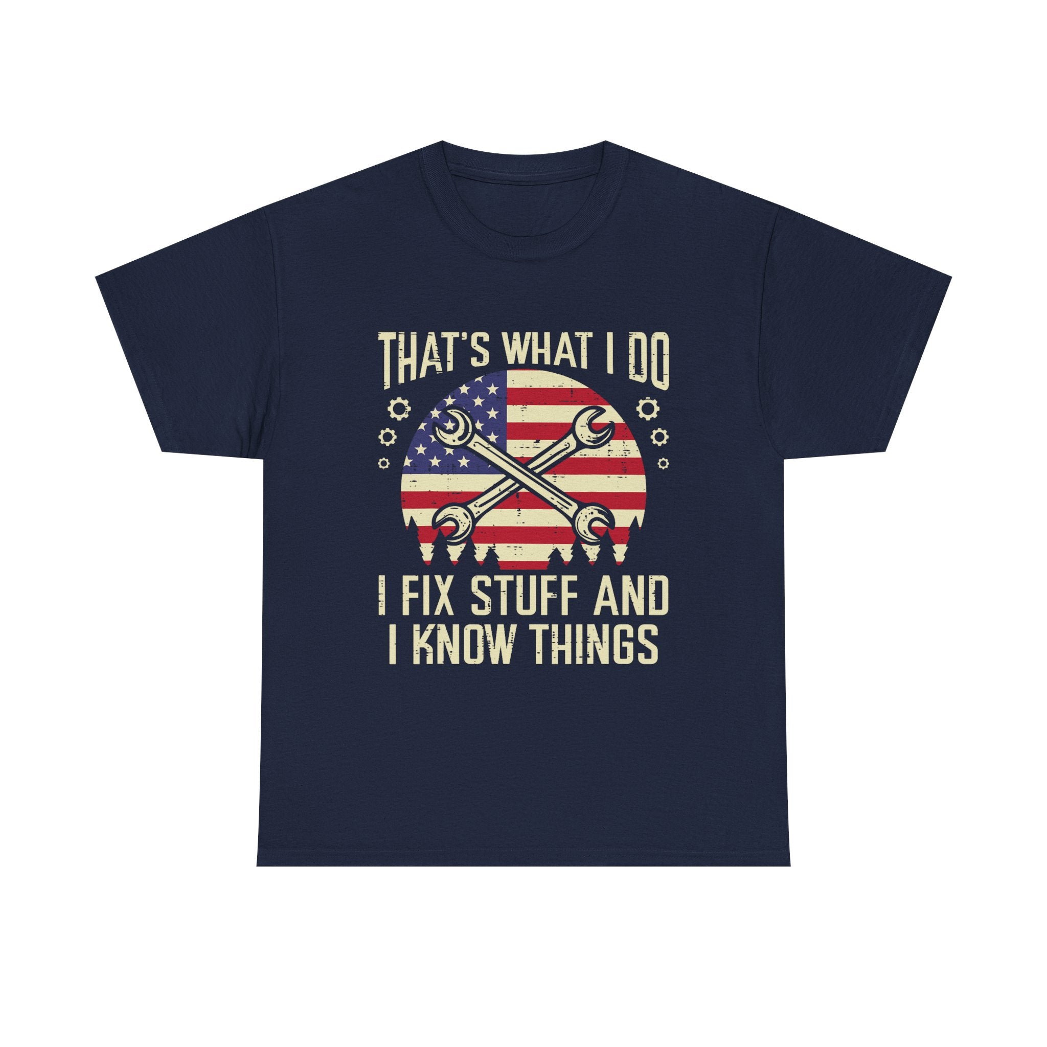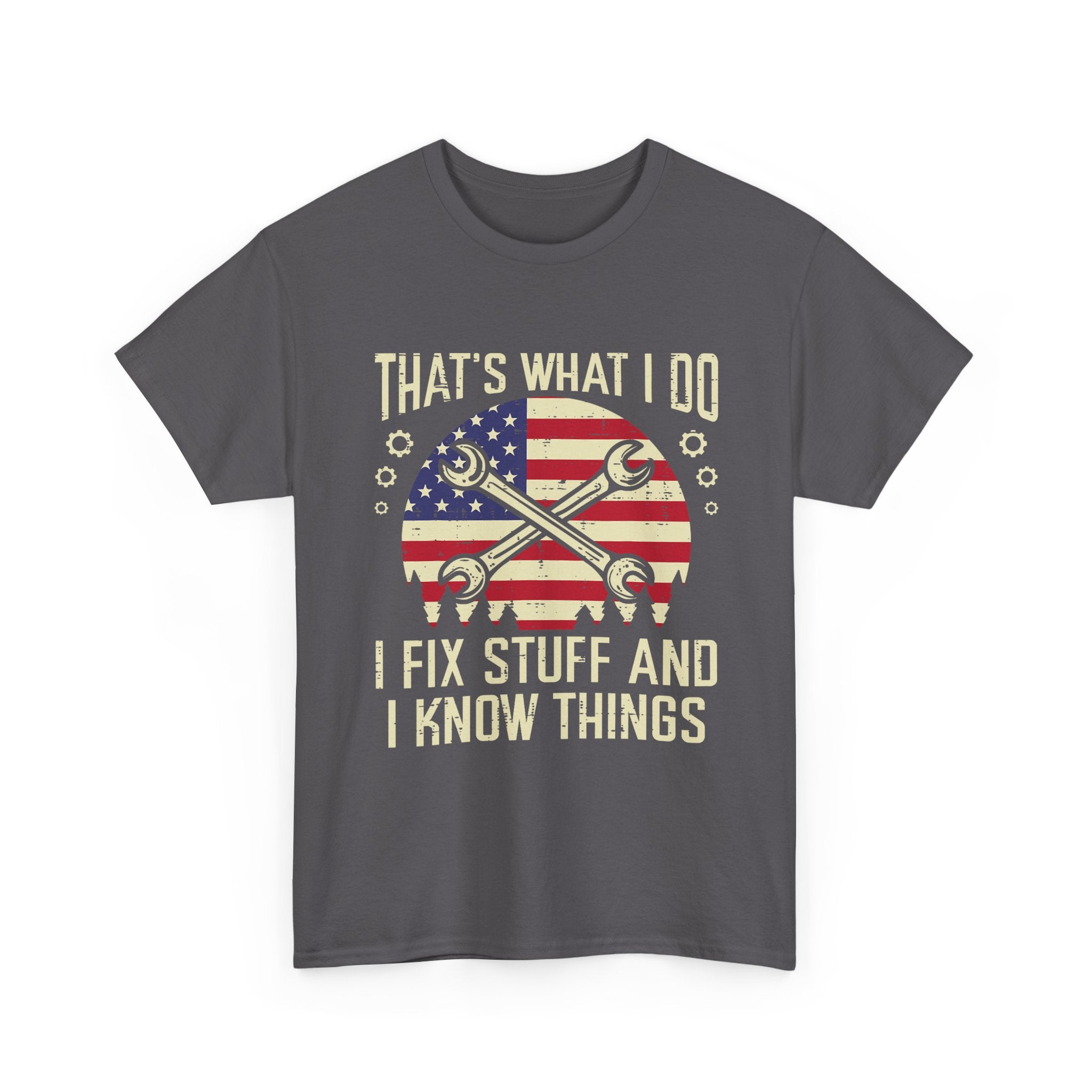 Mechanic T-Shirt – “That’s What I Do I Fix Stuff And I Know Things” American Flag Design